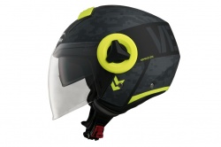 Comme sur la plupart des jets, on retrouve une boucle de fermeture de type microlock. Mais le jet se caractérise surtout par sa visière avec un mécanisme spécial «clic» qui permet de la retirer facilement et rapidement. La double configuration du casque permet de choisir entre un confort traditionnel (visière + pare-soleil intérieur) et un look plus moderne et dynamique (visière + visière intérieure).