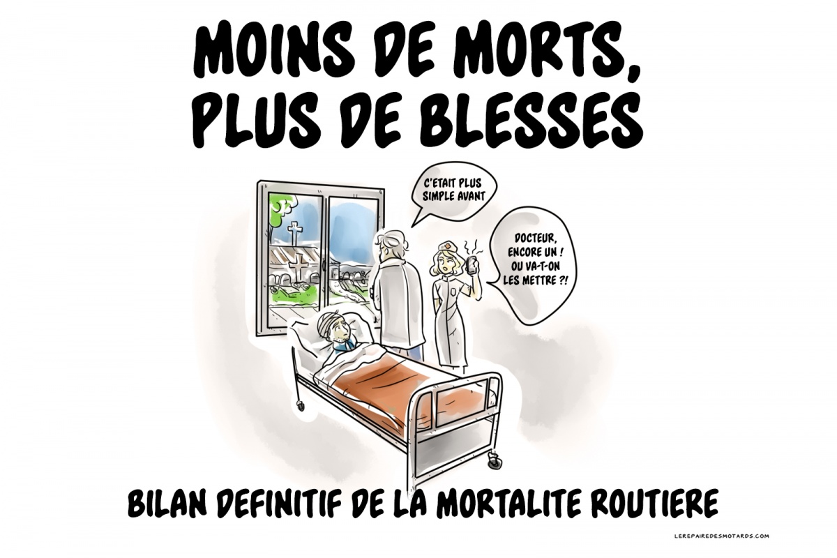 Le baromètre de la mortalité routière est un peu le rendez-vous régulier avec la mort. Et quand le bilan 2017 de l'insécurité routière est publié, il est un peu mi-figue, mi-raisin, avec un nombre de morts en baisse (et encore pas du côté des motards) mais un nombre d'accidents et de blessés en hausse ! On dirait presque un phénomène de vase communiquant qui ne va pas aider à résoudre le problème de la diminution des lits en hôpital (451.652 lits actuellement, en baisse de près de 25% depuis 1981 alors que la population augmente).