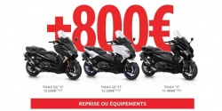 Yamaha propose également une prime de 800 € sur la reprise d'un deux-roues motorisé à la cote d'occasion de l'Officiel du Cycle. En l'absence de reprise de véhicule, l'acquéreur d'un maxi-scooter nippon bénéficiera tout de même de 800 € de bons d'achat à valoir sur l'équipement Yamaha.