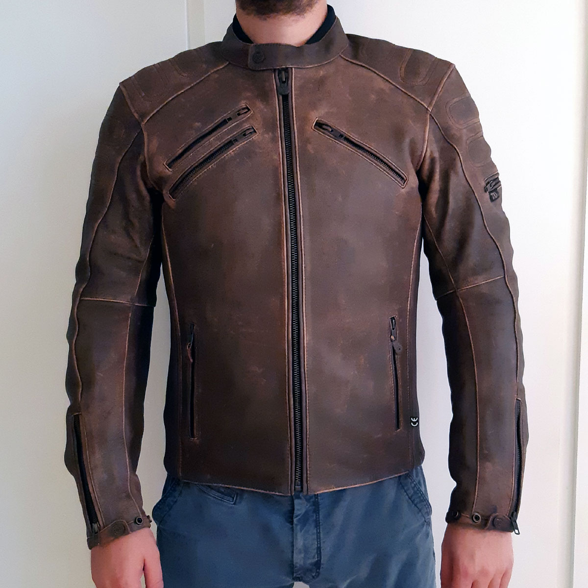 Cuir vieilli, doublure thermique amovible, protections CE, membrane étanche, soufflets d'aisance