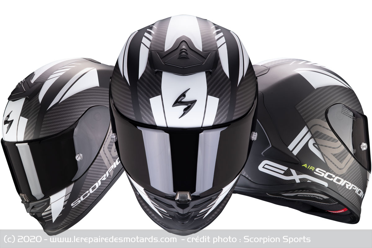 Disponible du XS au XXL, le casque Scorpion Exo-R1 Air est vendu à 399,90 € avec ses décos Halley ou Infini.