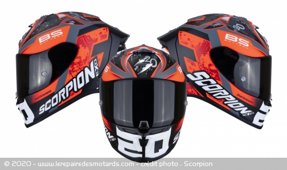 Sur la mentonnière, le large numéro 20 d’El Diablo s’affiche, tout en blanc et sur fond noir. Des chiffres sont aussi présents sur la partie supérieure de la coque, au niveau des aérations. La marque et le modèle, Scorpion Exo, s’affichent également sur les côtés, sans oublier un des sponsors du pilote français. Le numéro du tricolore est également présent derrière, sous le spoiler aérodynamique.