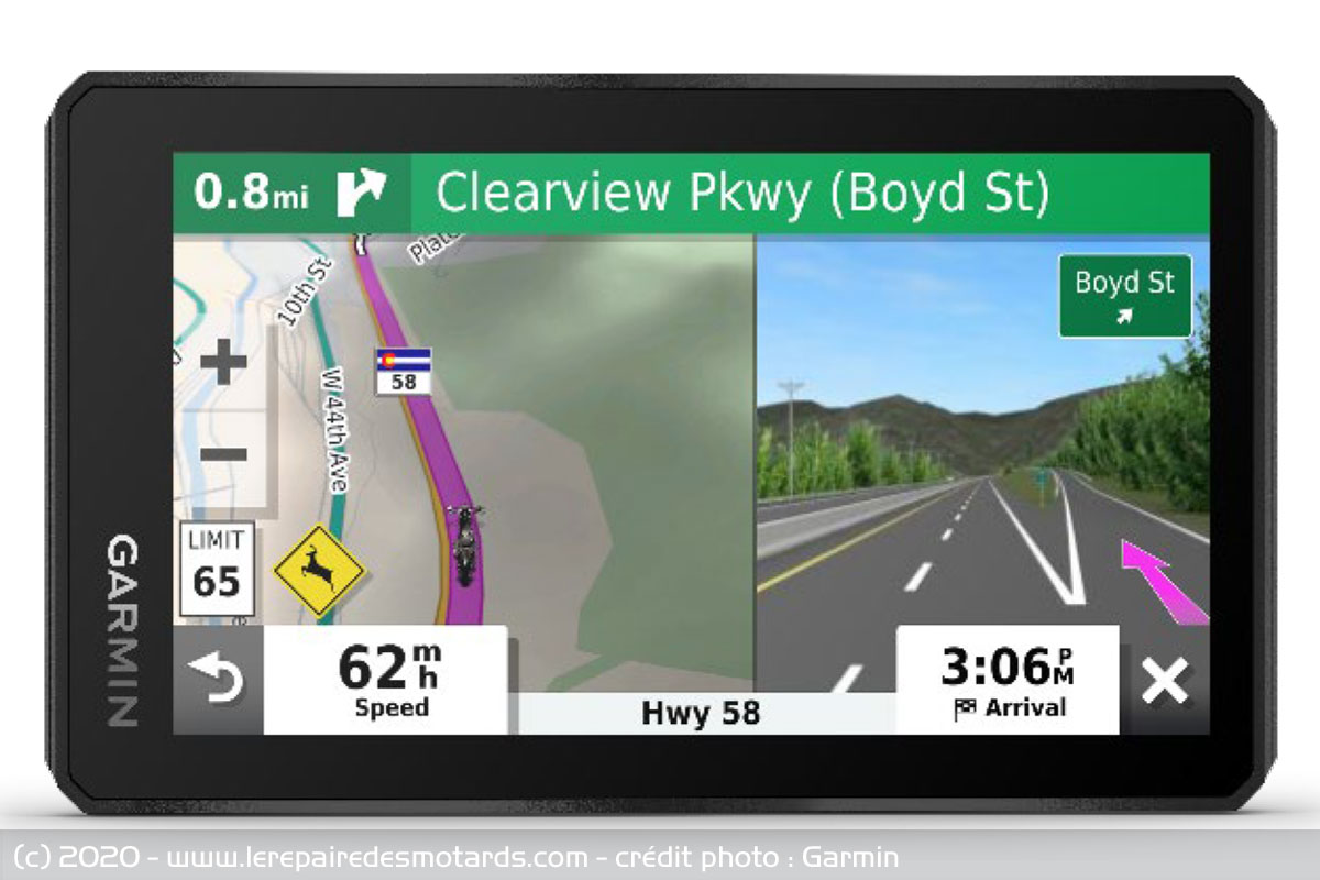 L'écran couleur de 14 cm (5,5 pouces) propose de son côté plusieurs modes d'affichage. Mais ce sont surtout les fonctionnalités qui le distinguent à commencer par sa nouvelle fonction Garmin Adventurous Routing qui permet d'explorer les pistes grâce aux cartes topographiques intégrées. Grâce aux options il est possible d'intégrer aux itinéraires des points d'intérêts iOverlander, les avis de voyageurs de TripAdvisor ou encore des contenus Foursquare.