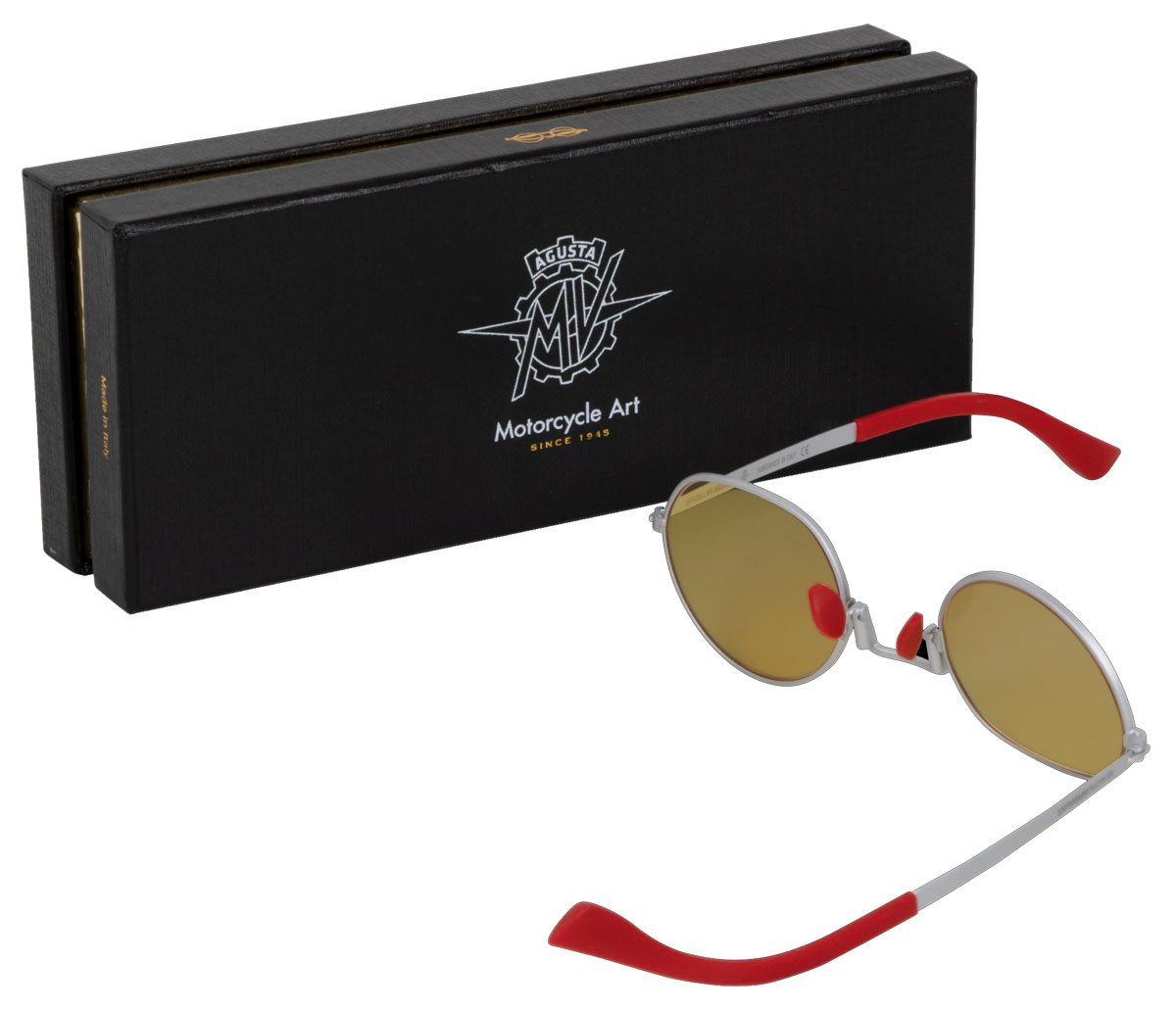 MV Agusta a donc fait fabriquer sous licence par le lunetier milanais Movitra une paire de lunettes équipées de verres photochromiques Barberini protégeant de 100% des UV. Pour le reste, elles sont réalisés en acier inoxydable avec des branches en titane.