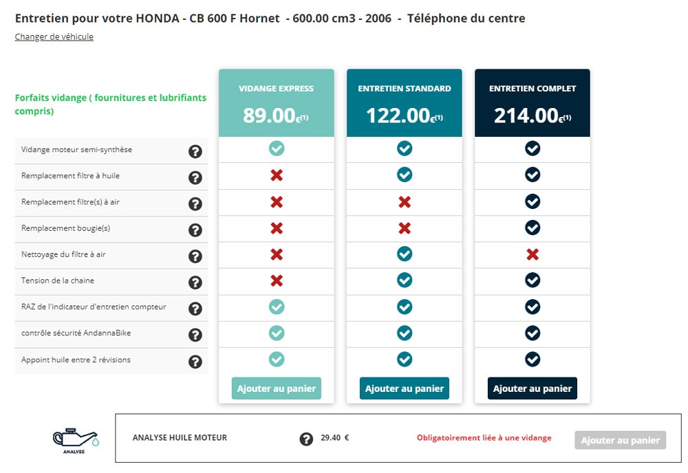 L'offre se veut ensuite simple avec un système de forfaits simples et assurés sans surprise (et pas un tarif horaire hormis cas spécifique et devis) et plusieurs services, allant de l'entretien au changement de batterie, remplacement des pneumatiques, kit-chaines, plaquettes de frein (à partit de 35€ TTC) ou encore vidange (à partit de 59€ TTC), les opérations étant réalisées par des techniciens spécialisés.