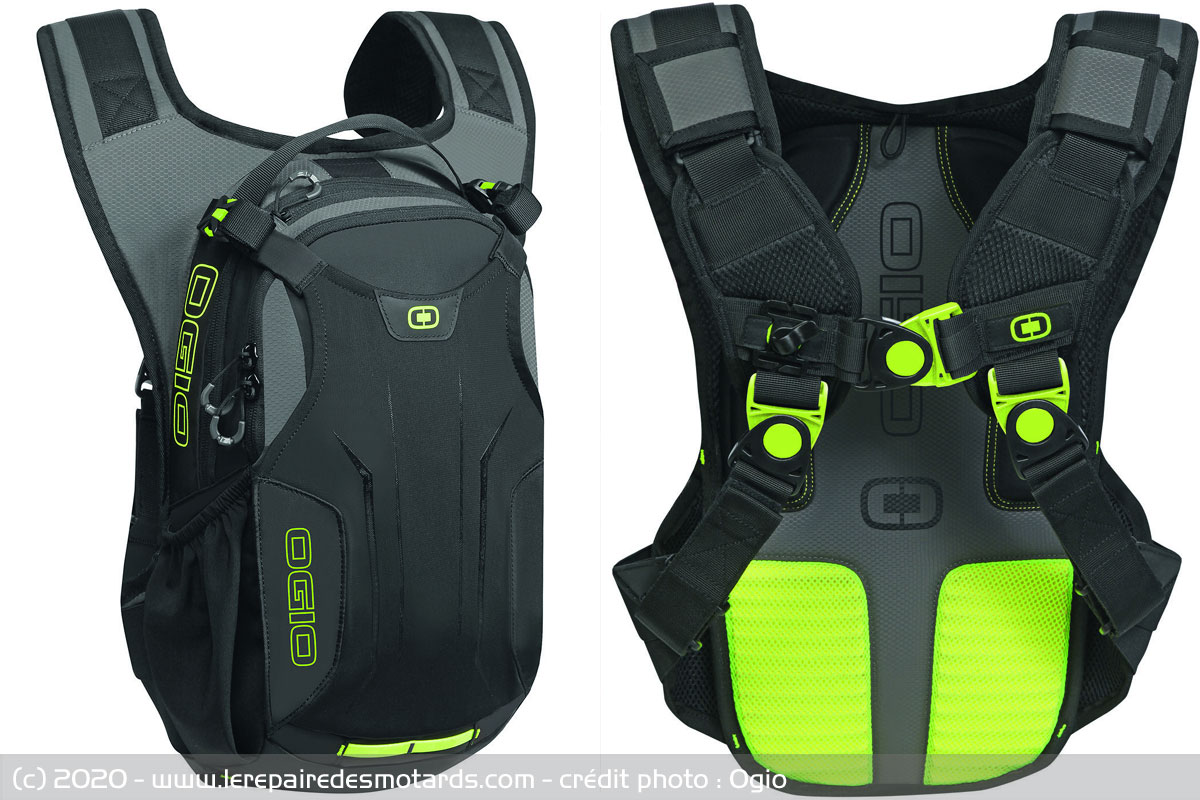 Le sac Ogio est également muni d'une poche à eau de deux litres pour se rafraîchir pendant l'effort. Le dos du sac est quant à lui recouvert de mesh et muni d'un canal de ventilation pour réduire la chaleur. Les bretelles sont accompagnées de sangles pectorales et ventrales pour un meilleur maintien.