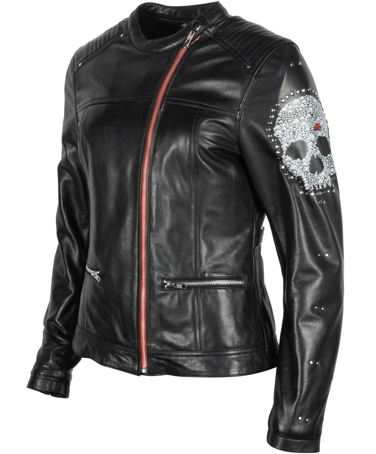 Le style de blouson est pour le moins très affirmé avec sa coupe ajustée, sa fermeture éclair asymétrique bordée de cuir rouge et sa tête de mort imprimée sur l'épaule gauche, bordée de petits clous.