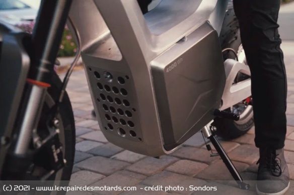D'une capacité de 4 kWh, la source d'énergie est également amovible et se retire tout simplement par un glissement latéral après avoir déverrouillé la serrure. Sondors promet ainsi une recharge facilitée en emmenant sa batterie chez soi pour la brancher.
