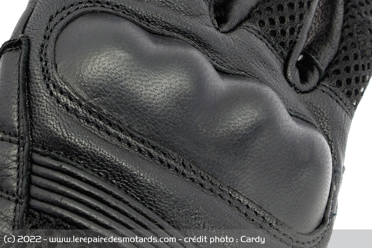 Le modèle se dote également de plusieurs renforts en cuir sur la paume et la tranche de la main, ainsi que d'une coque de protection aux métacarpes revêtue de cuir. Il est certifié EPI de niveau 1 KP. On retrouve aussi une manchette courte à serrage velcro et un empiècement en accordéon sur le dessus pour faciliter les mouvements.