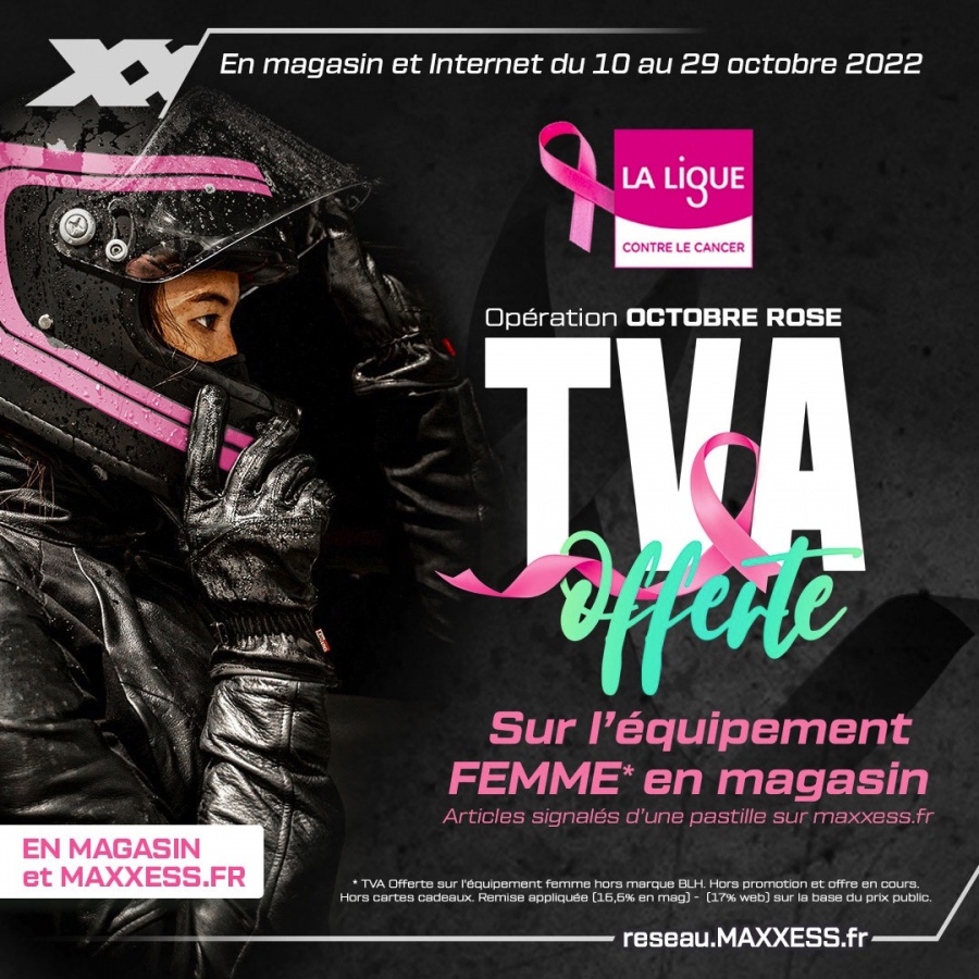 Cette année, Maxxess a fait le choix de rejoindre le mouvement et de soutenir La Ligue contre le Cancer durant Octobre Rose. En plus de mettre en avant l'importance du dépistage, l'enseigne spécialisée dans les équipements pour les motards va plus loin et a décidé d'offrir la TVA sur l'ensemble des équipements féminins présents en magasin et sur son site internet. En outre, des affiches présentes dans les magasins permettent d'en apprendre plus sur ce cancer.
