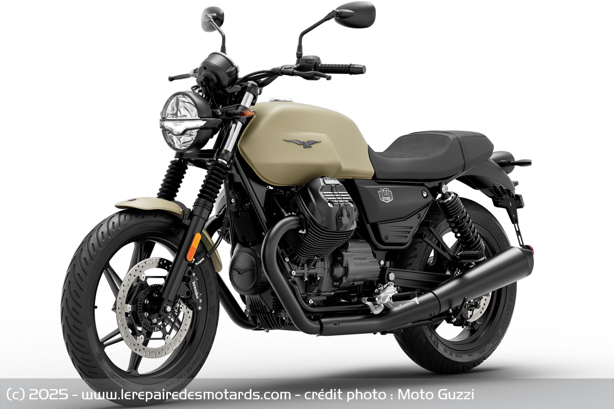 Du côté de l'emblématique gamme de roadsters néo-rétro V7, Moto Guzzi apporte quelques livrées supplémentaires. En plus du bleu et du noir, la Stone se décline désormais en beige. La palette de la Special oscille entre noir et blanc et enfin la V7 Sport, apparue cette année, voit un Rosso Monza enrichir sa ligne.