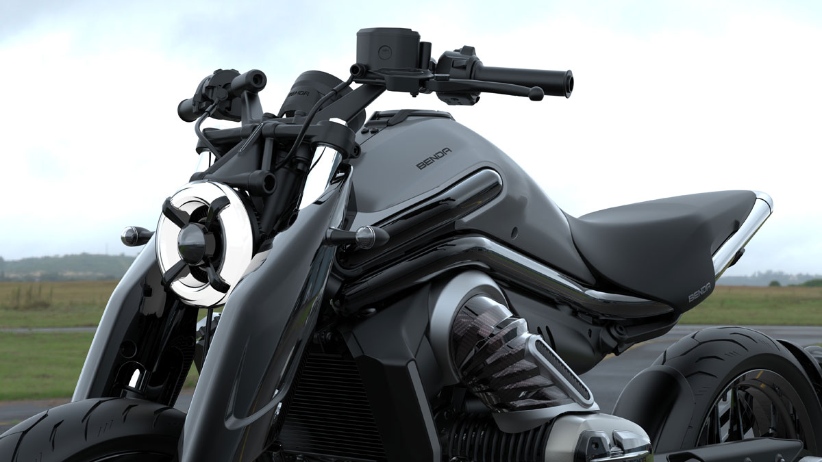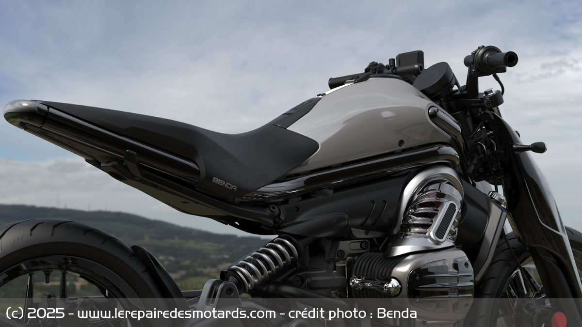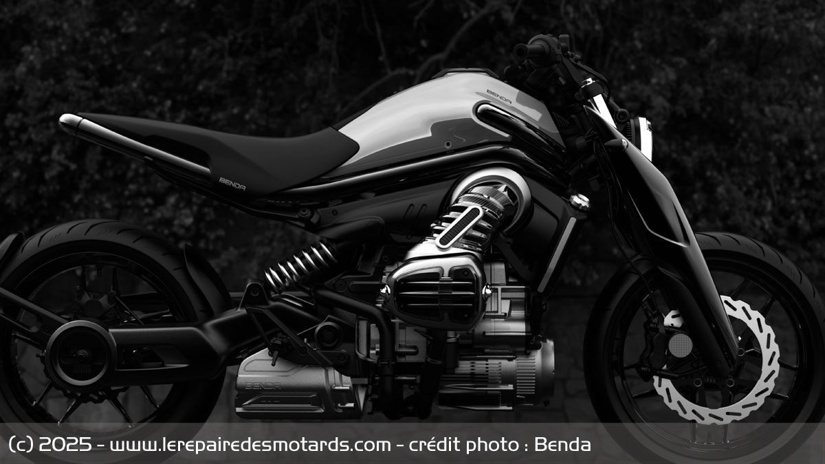En effet, le moteur boxer de 250 cm3 est bien plus qu'un simple bicylindre à plat à refroidissement liquide et double arbre à cames en tête, puisqu'il est associé à un petit moteur électrique situé en dessous et qui lui permet d'atteindre des performances que l'on ne soupçonnerait pas sur un quart de litre. Benda évoque en effet une puissance maximale de 62 chevaux pour pas moins de 100 Nm de couple. La marque avance également que son concept est capable de réaliser le 0 à 100 km/h en 3,7 secondes.