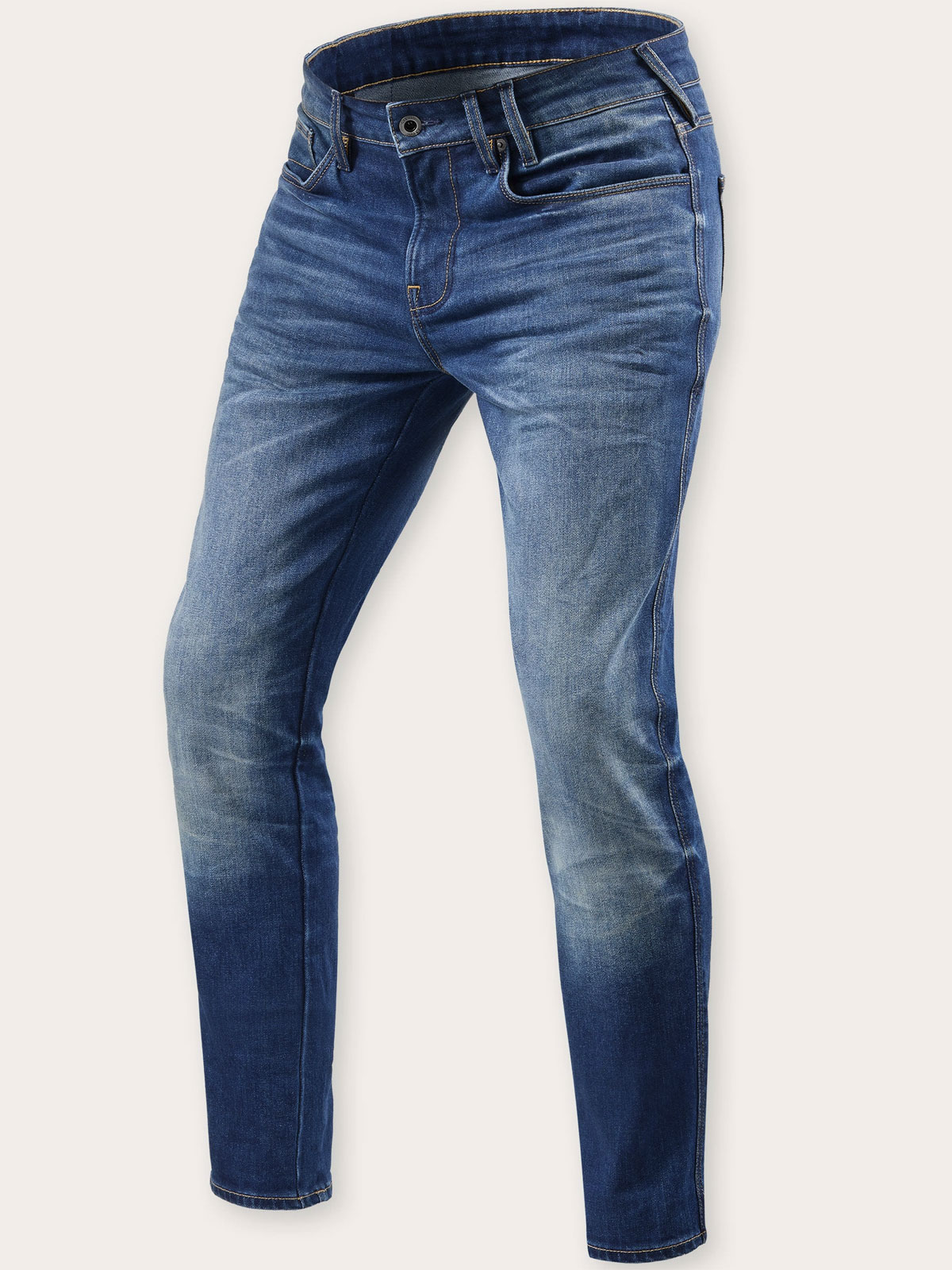 Décliné dans deux nuances de bleu, le jeans moto Rev'it! Carlin SK est proposé dans quatre longueurs de jambes et vendu 199,99 euros.