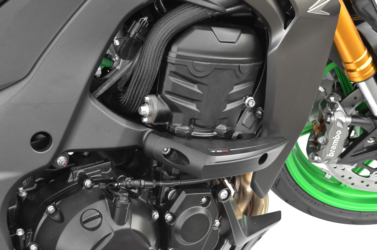 Ces patins qui s'intègrent discrètement au design de la Z, sont installés sur des platines de fixation en aluminium usiné et peintes en noir. Ces dernières se fixent au cadre sur deux points existants, ce qui facilite le montage. Livré avec toute la visserie nécessaire, le kit de protection est vendu 314 euros.