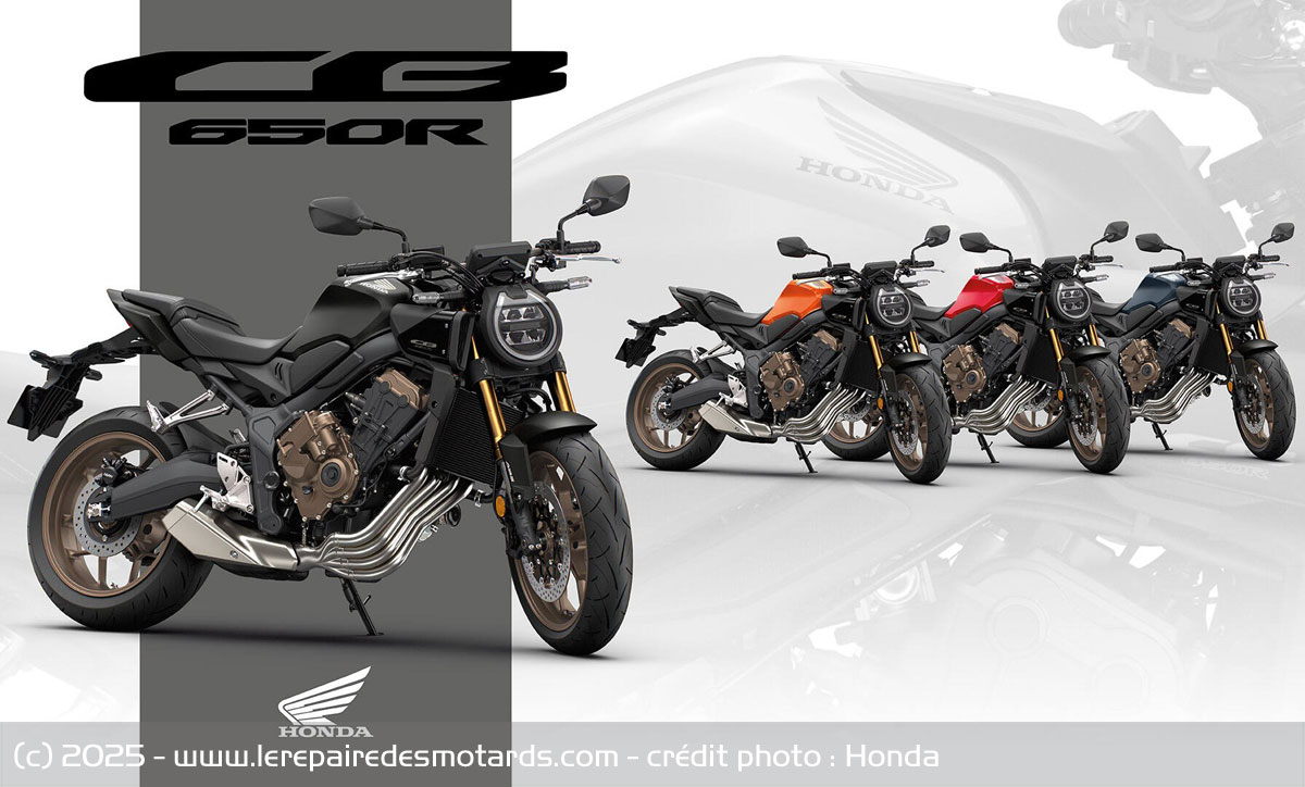 - Coloris CB650R : noir mat, bleu mat, orange, rouge