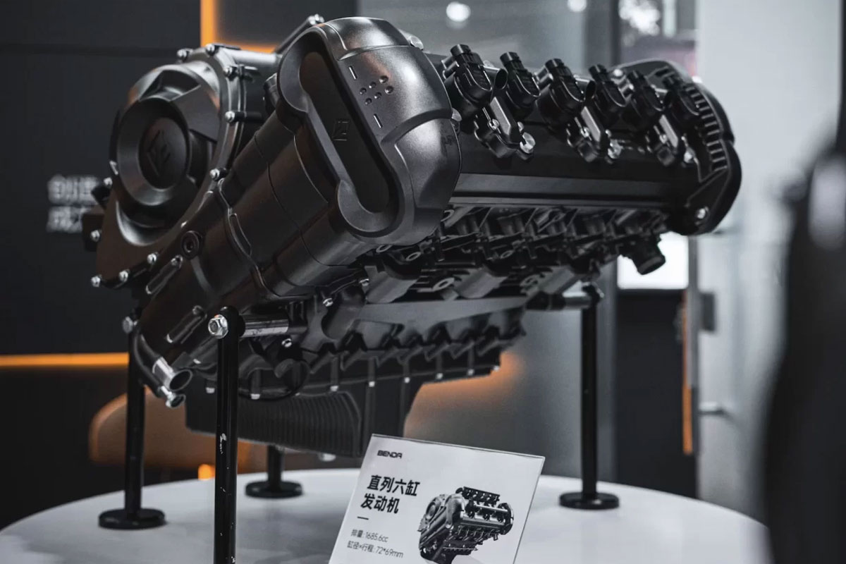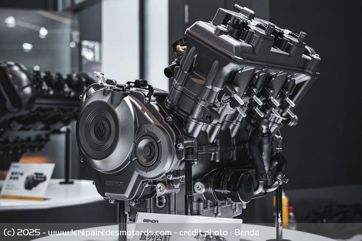 Enfin, la marque voit également plus grand avec un énorme six cylindres en ligne de 1.700 cm3. Développé pour être utilisé comme élément structurel du châssis, avec un système de refroidissement liquide fermé et un réservoir d'huile séparé, ce moteur va surtout introduire le système de transmission à double embrayage électromagnétique (EM-DCT) mis au point par les ingénieurs chinois. Il se destine à des tourers haut de gamme. C'est clairement le segment de la Honda Gold Wing qui est ici visé par Benda.