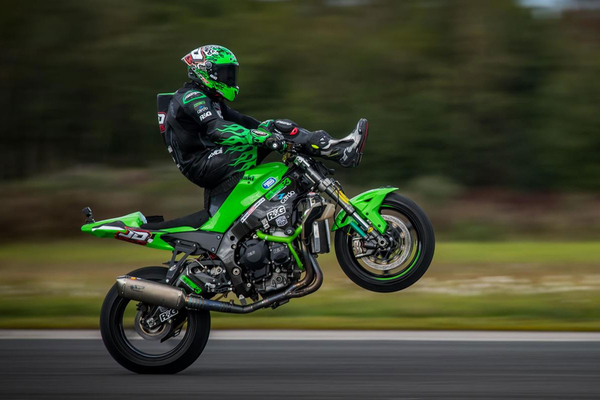 Dans le genre, le Britannique Jonny Davies est un sérieux candidat. Ce stunter anglais, très populaire outre manche, est déjà entré à trois reprises dans les records du monde Guinness en passant les 175 km/h en wheeling assis sur son guidon, en étant tracté par sa Kawasaki Ninja H2 SX à près de 257 km/h ou encore en établissant le plus grand nombre de donuts autour d'une moto en wheeling aux côtés de Paul Swift.