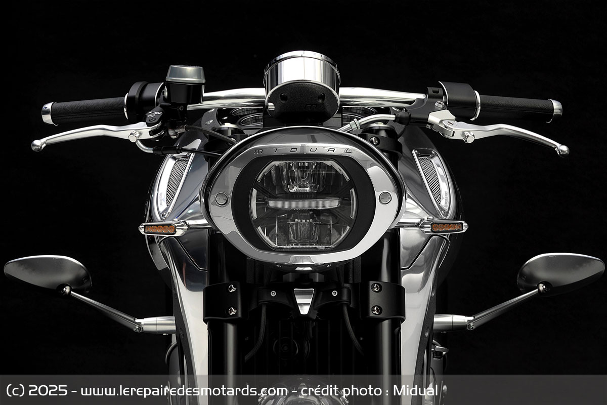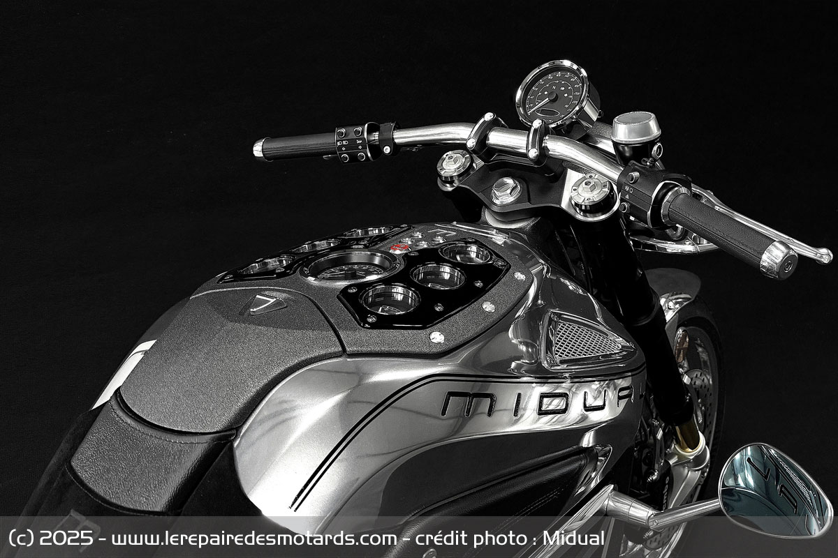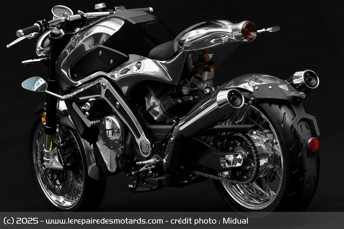 Le roadster grand luxe reprend ici sa boucle arrière taillée dans la masse et supportant une selle monoplace, mais pouvant se décliner en version biplace sur option. Eh oui, la personnalisation sur mesure reste un facteur clé chez Midual.