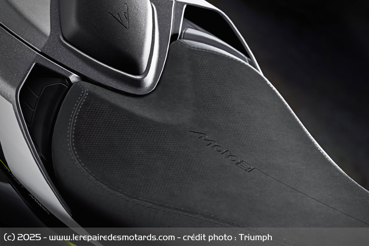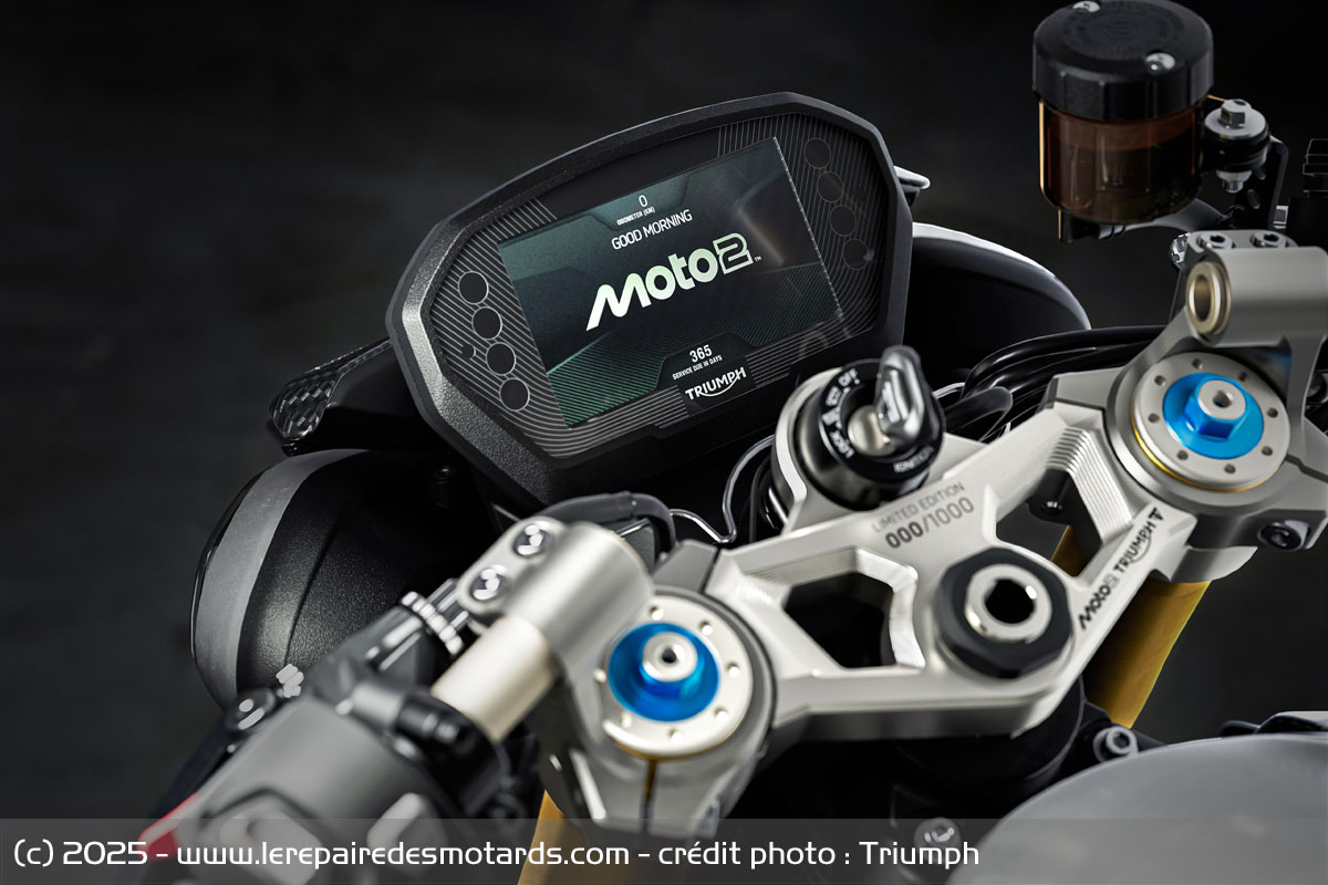 Pour l'habillage, Triumph a opté pour ses couleurs officielles avec une teinte gris et noir complétée par des motifs et des éléments en jaune. L'autre différence est qu'il s'agit ici d'une édition limitée à 1.000 exemplaires. Chaque modèle est accompagné de son numéro de série gravé sur le té de fourche supérieur et bénéficie d'une animation d'écran spécifique lors du démarrage.
