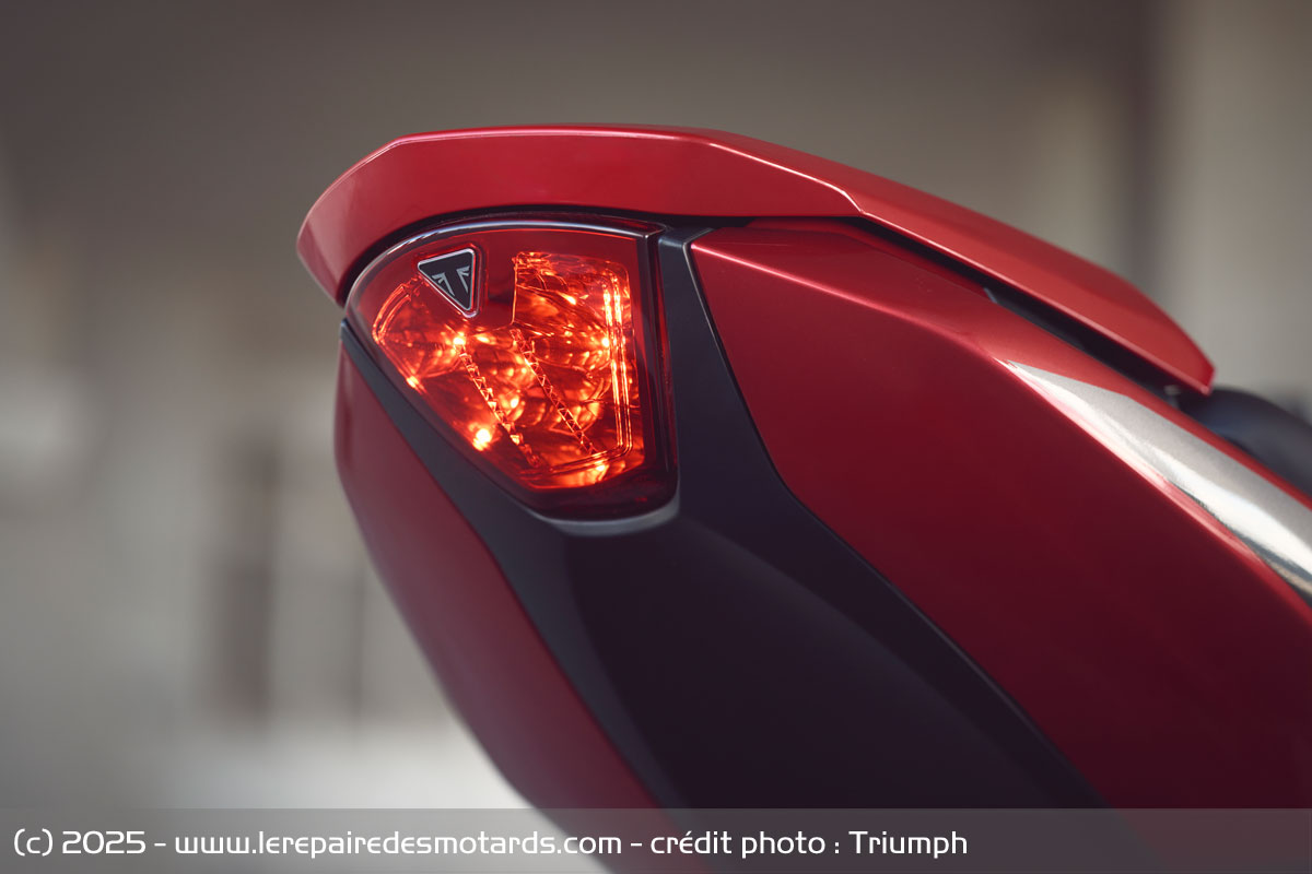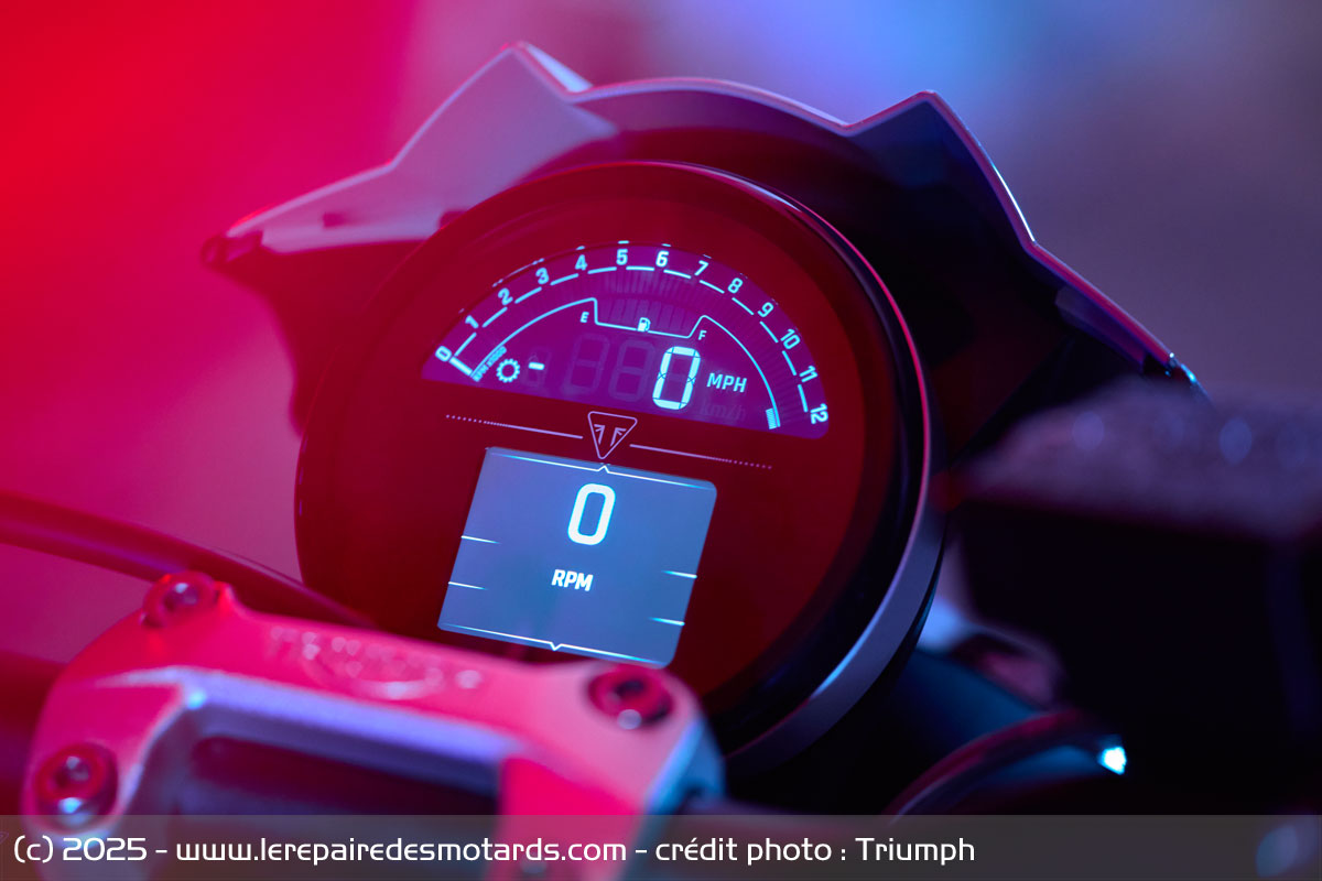 Tout cela est complété par un système d'assistance qui couvre l'essentiel de ce que l'on attend d'un roadster moderne avec trois modes de conduites, un shifter bidirectionnel, un ABS et un contrôle de traction optimisés sur l'angle, mais aussi un régulateur de vitesse et des clignotants à arrêt automatique. Pour l'instrumentation, Triumph reconduit le cadran daté de la Tiger Sport avec un afficheur LCD pour la vitesse et le régime moteur accompagné d'un petit écran TFT connecté en complément.