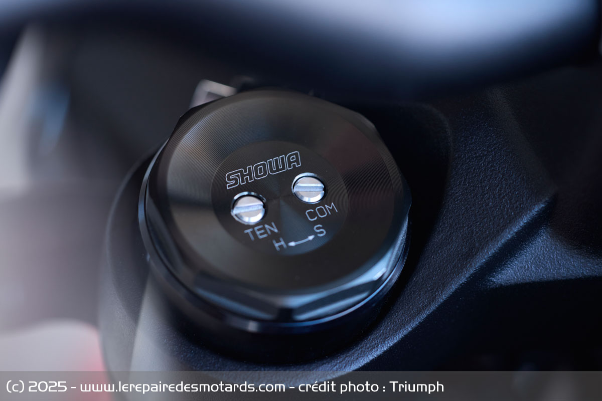 - Suspension arrière : Amortisseur AR Showa, avec précharge et amortissement en détente réglables, débattement de 130 mm.
