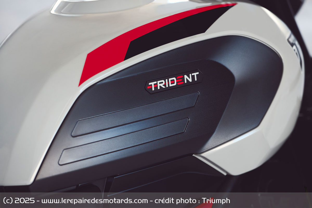 Visuellement, on retrouve clairement la filiation avec la Trident 660, à l'image du phare avant rond et de la forme caractéristique de réservoir, mais l'ensemble parait bien plus dynamique avec notamment une tête de fourche et un sabot moteur profilés. Au-delà du noir intégral de base, la Trident se décline dans deux autres livrées grises et rouges. Les trois sont équipées de jantes dorées.