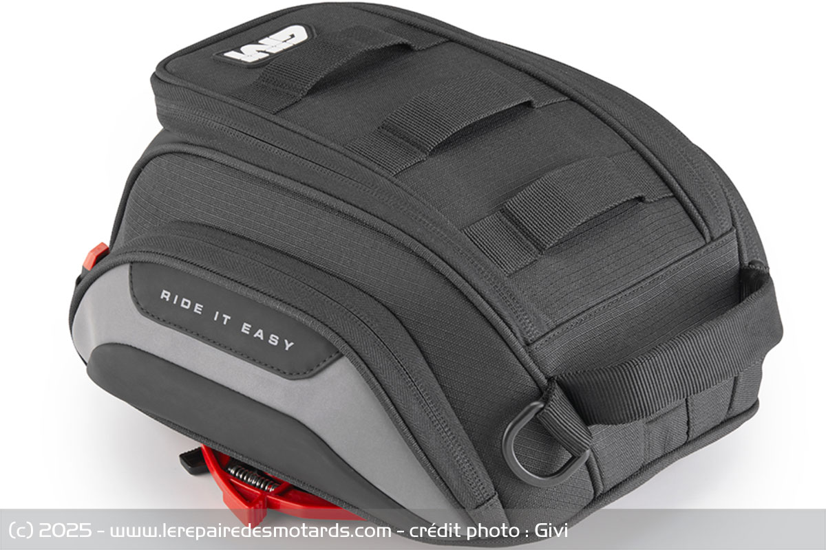 Proposée en noir, la sacoche de réservoir Givi Easy01 Tanklock est vendue 69 euros. Il faut ajouter à cela la bride Tanklock spécifique au réservoir de chaque modèle.