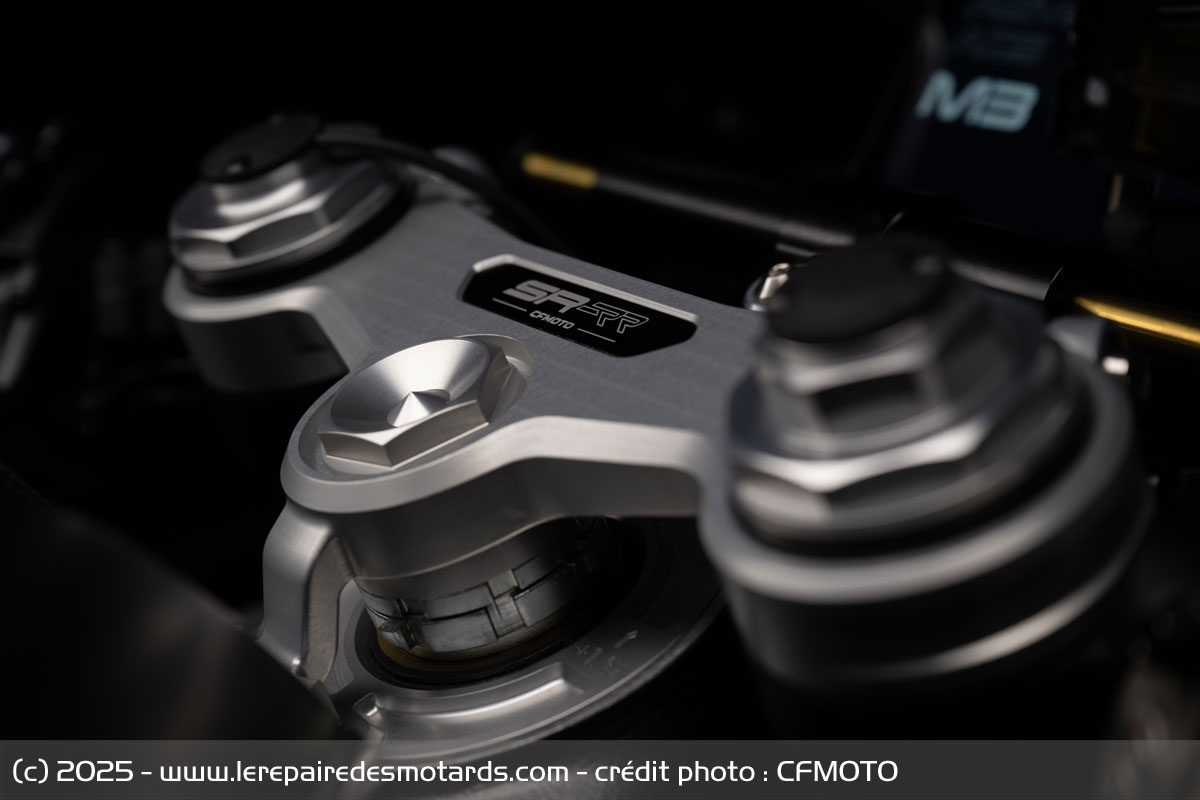 Celle-ci bénéficie d'un carénage aérodynamique dont les ailerons s'ajustent en temps réel pour optimiser la force d'appui jusqu'au-delà des 300 km/h. CFMOTO promet également une technologie de pointe marquée, entre autres, par des suspensions actives.