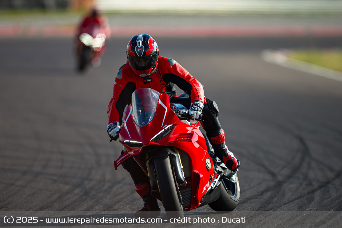 Cette nouvelle Panigale V4 R, la troisième du nom après le modèle 2019 et l'évolution de 2023, s'appuie ainsi sur la base technique de la 7e génération de superbikes transalpines, à commencer par le moteur Desmosedici Stradale R de 998 cm3 qui répond à la norme Euro 5+ avec une puissance maximale de 218 ch à 15.750 tr/min et qui voit sa courbe de couple progresser à tous les régimes avec un maximum de 114,5 Nm atteints à 12.000 tr/min. Ces valeurs peuvent être encore repoussées grâce à l'installation de l'échappement racing qui permet de monter jusqu'à 235 chevaux, voire même 239 chevaux avec l'huile Ducati Corse Performance. Dans cette configuration, la V4 R est en mesure d'atteindre les 330,6 km/h !