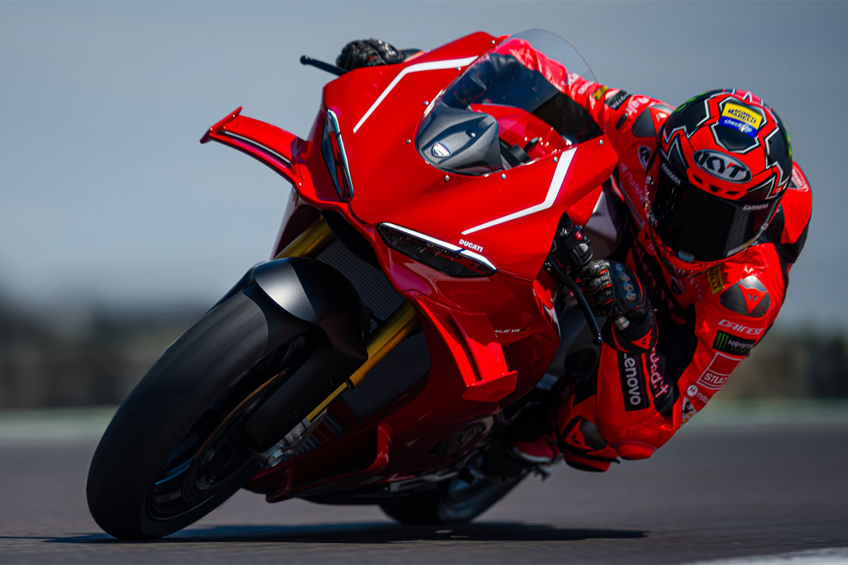 Autre nouveauté, Ducati introduit pour la première fois ses Corner Sidepods sur une moto de série. Développés sur la Desmosedici GP21, ces éléments aérodynamiques permettent d'améliorer la vitesse de passage en courbe. Le carénage est quant à lui redessiné pour gagner en agilité avec notamment de nouveaux ailerons améliorant la force d'appui de 25% et une prise d'air avant dynamique qui augmente la pression d'admission en ligne droite. L'ergonomie se veut quant à elle toujours plus sportive.