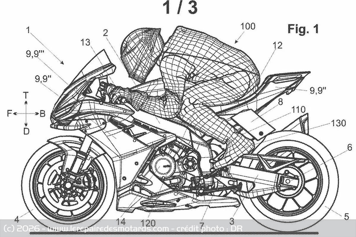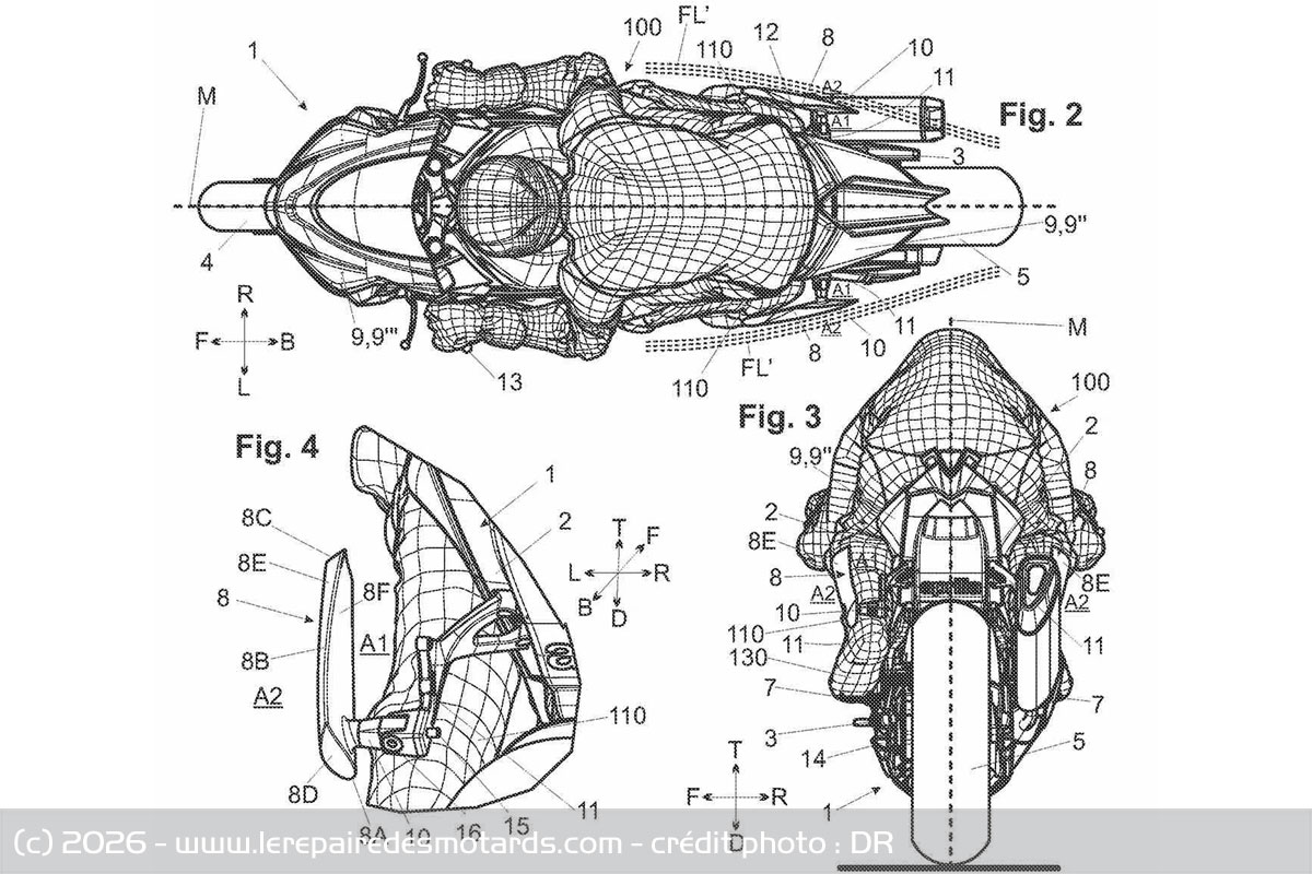 Mais concrètement, quel est l'intérêt d'un tel dispositif ? Le brevet explique d'abord que ceux-ci permettent d'améliorer l'aérodynamisme de la moto en réduisant la traînée en ligne droite. L'aileron fait surtout son oeuvre en courbe lorsque la moto est sur l'angle et que le pilote sort son genou, un espace se crée et laisse passer un flux d'air qui vient générer une force d'appui sur l'aileron et améliorer l'adhérence. De l'autre côté, la jambe reste collée à la moto et empêche l'aileron opposé de générer un appui inverse.