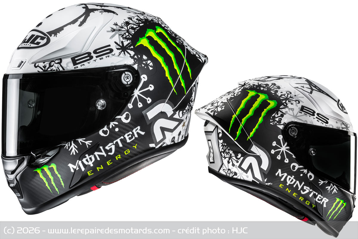 Proposé de base en noir brillant et noir mat, le casque intégral HJC RPHA 1 V2 Carbon se décline aussi à travers deux replica Quartararo. Comptez 749,90 euros pour le modèle de base et 999,90 euros avec les décos.