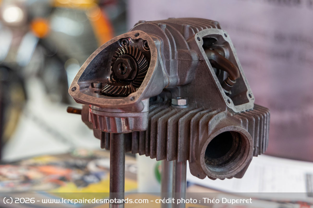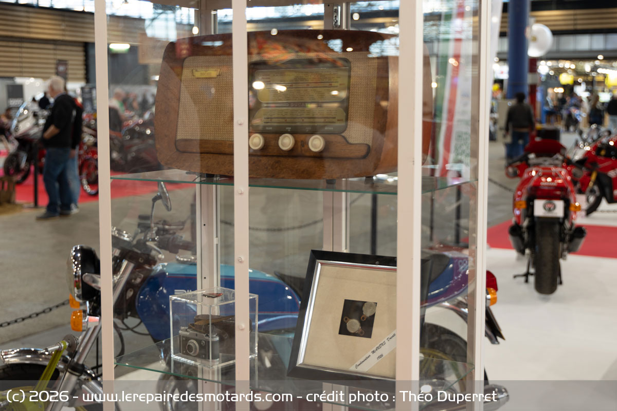 C'est depuis l'épicentre de l'exposition que Gérard Chabrol prend le relai pour me montrer quelques curiosités. Il est l'heureux propriétaire d'une des toutes premières machines Ducati. D'abord fabricant de pièces détachées de radio, de caméras, bobines et projecteurs, Ducati se lance après guerre dans les petits moteurs de 48 cm3 adaptables sur des vélos. Celui de Gérard, un tandem, est le plus ancien présent sur l'exposition. Vient le tour d'une moto de GP de 1956 avec un moteur 125 cm3 double arbre à cames. Une moto unique qui était celle de Lesage. « On ne sait pas vraiment comment quelqu'un en est arrivé à la posséder », me confie Gérard.