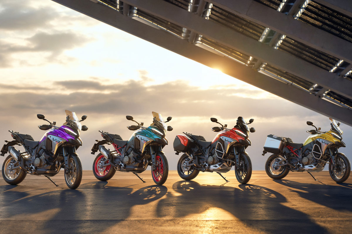 Outre les traditionnelles teintes blanches, rouges et noires, la Multistrada peut désormais se parer de nouvelles teintes vives et des livrées spéciales d'autres modèles, avec des finitions mates ou brillantes selon les goûts. Ducati renforce aussi son partenariat avec Lamborghini en ajoutant quelques teintes hautes en couleur proposées par le fabricant automobile. Du violet au vert fluo, tout est possible ou presque.