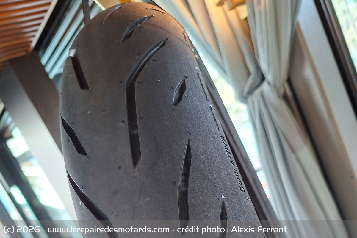 La bande de roulement est désormais linéaire et pleine afin de maximiser l'adhérence et la longévité. C'est aussi le cas sur les épaulements avec une surface de contact accrue pour plus d'adhérence sur l'angle. Dans le même temps, la profondeur des sculptures a été accrue pour plus d'efficacité sur le mouillé. Enfin, on note l'ajout de micro-entailles sur l'extérieur. Ces petites cavités permettent d'améliorer la montée en température et la stabilisation de celle-ci aux épaules. Les profils extérieurs sont également plus ouverts pour davantage de grip à l'accélération.