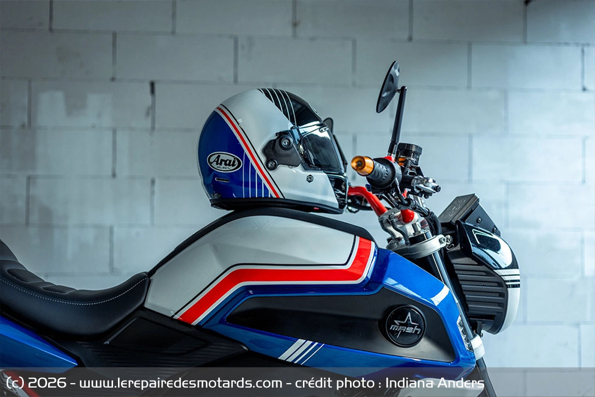 Ici, Cafe Racer Only a fait le choix de ne procéder qu'à une modification esthétique de la moto, sans dénaturer sa ligne générale et sans modifier ses performances, mais en allant puiser son inspiration dans le casque intégral Arai Concept X Temu Blue.