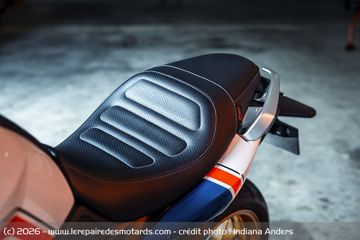 Avec ses lignes rétro, le couvre-chef a dicté l'orientation du projet, pas avec une reproduction à l'identique de la déco, mais en interprétant les codes esthétiques et en les transposant au roadster à travers une livrée signée Peinture F2. Il en ressort une version tricolore aux bandes sportives plutôt réussie et agrémentée d'un guidon rouge paré d'embouts dorés, de flancs de radiateurs arborant un 750 stylisé et d'une selle personnalisée par Sellerie Briant.
