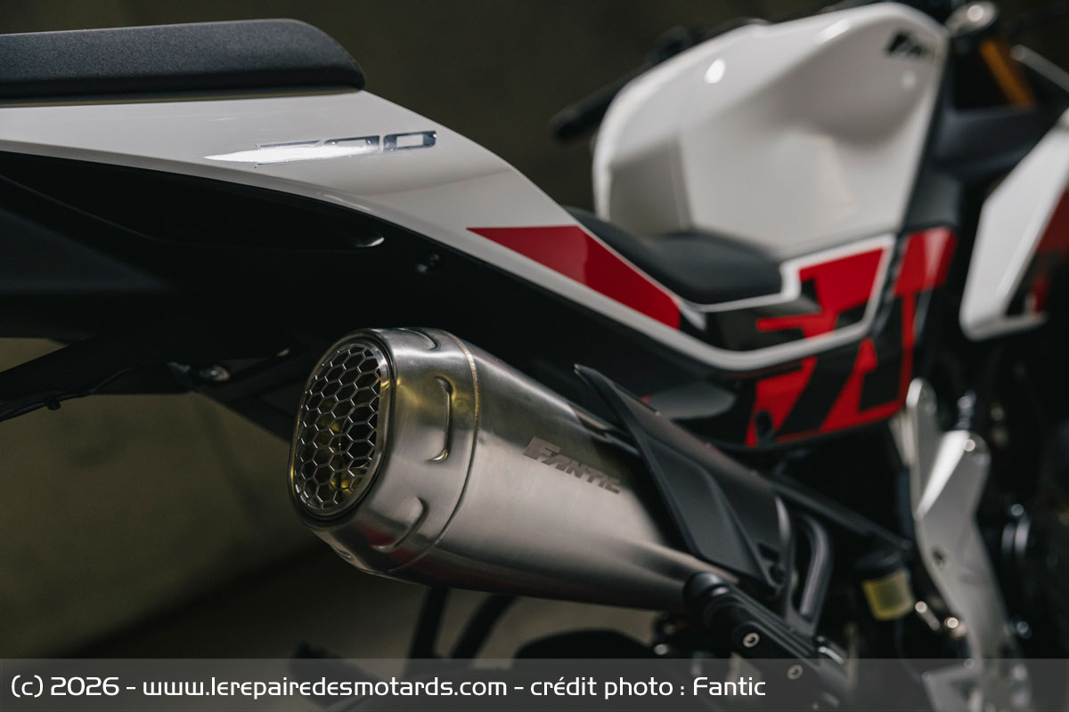 - Suspension arrière : bras oscillant en aluminium avec bras de renfort, amortisseur Fantic réglable en précharge, débattement de la roue arrière - mm