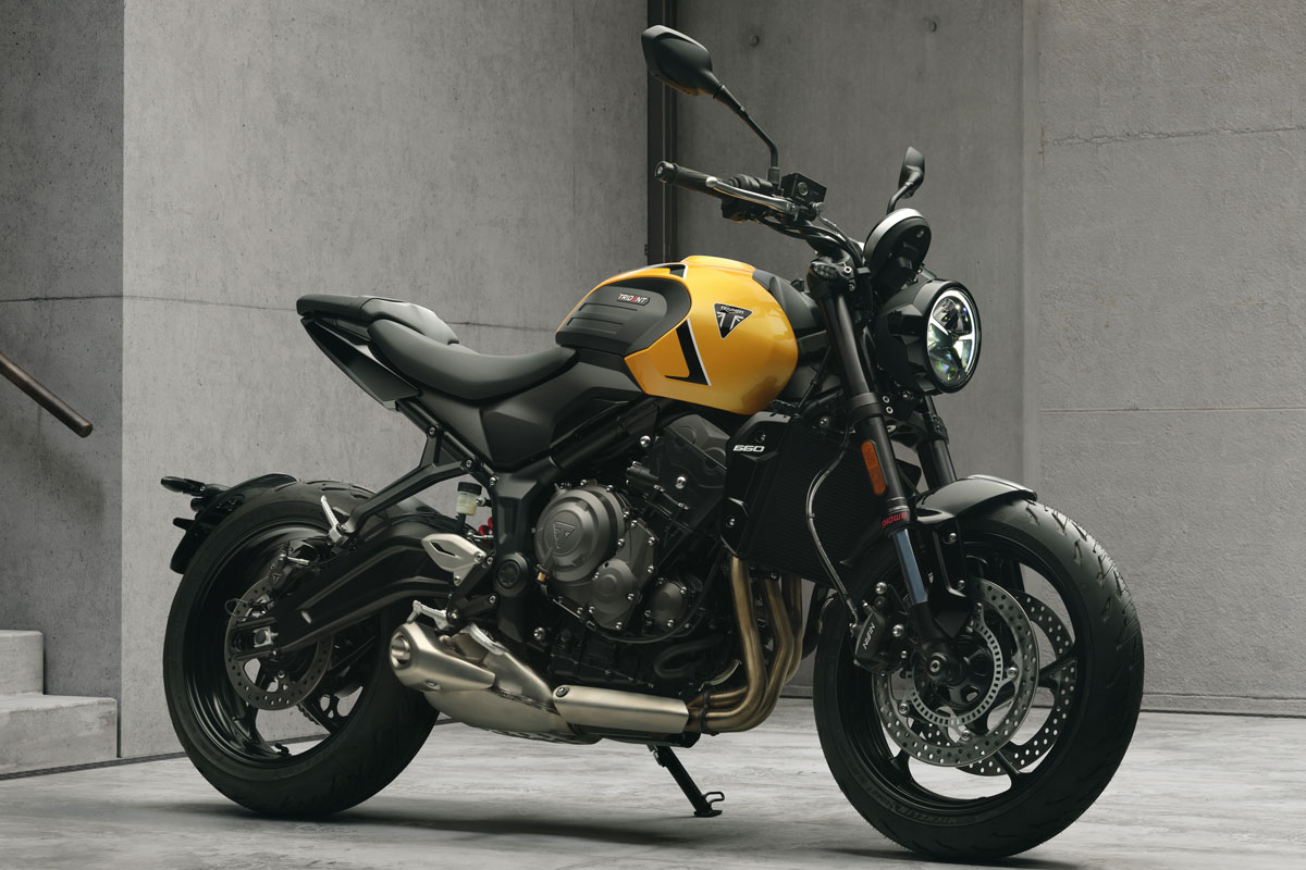 En 2021, Triumph lançait sur le marché son roadster Trident 660, un modèle d'entrée de gamme accessible aux permis A2 et adoptant un positionnement plus abordable que la célèbre famille Street Triple. Après en avoir décliné la base technique à l'univers routier avec la Tiger Sport et à celui des sportives avec la Daytona, Triumph avait précédé à une première évolution l'an dernier.