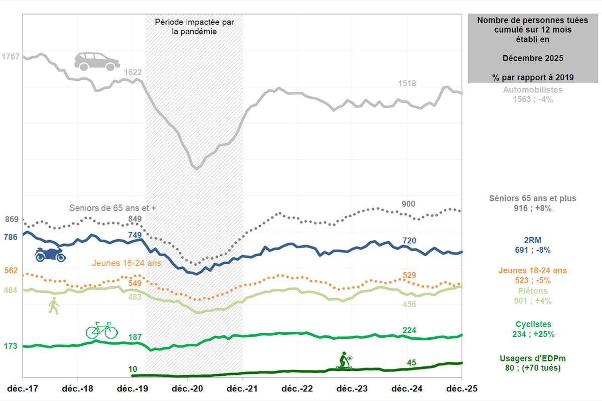 02-02-2026 13:14..On oublie les piétons (456 morts en 2024) c’est beaucoup !Mais le mode de transport le plus dangereux,hélas,c’est la moto(22 fois plus élevé qu’en voiture),le vélo et la trottinette(7 a 10 fois plus élevé qu’en voiture),la voiture est le mode le plus « sûr »(carrosserie,aides à la conduite,occupants mieux protégés)..