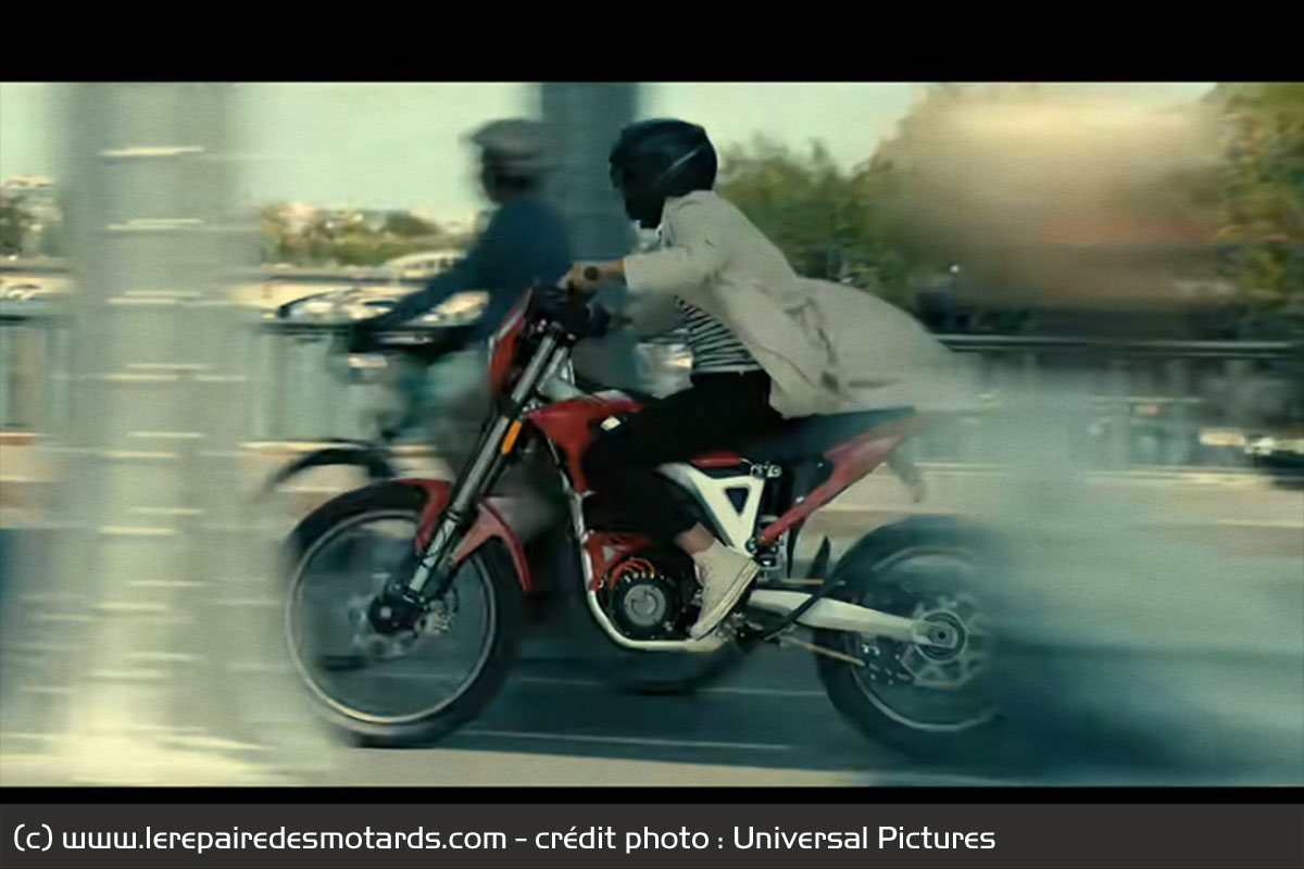 Outre quelques scooters que l'on pourra croiser durant les scènes urbaines, c'est à la toute fin du film, lors du règlement de compte dans le cimetière que l'on retrouve d'autres motos. Fini l'électrique, ce sont cette fois des hommes de main armés qui débarquent sur trois enduros deux-temps maquillés en noir pour stopper Zee. Attention, moteurs explosifs. Littéralement.
