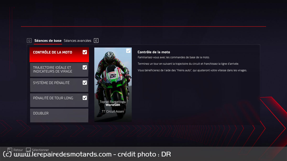 Si MotoGP a su apporter un peu de fraicheur avec son Mode NINE cette année, SBK 22 fait plus simple. Courses simples, championnat personnalisable, contre-la-montre et mode carrière. Voilà tout. Et pour le dernier cité, il s'agit d'un copier-coller de celui de MotoGP.