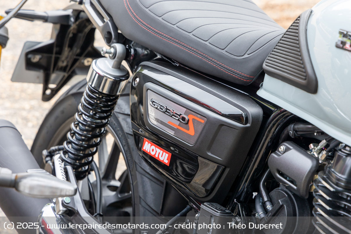 La Honda GB 350 S mise sur la simplicité fonctionnelle. Son rayon de braquage court la rend maniable pour les demi-tours et les manœuvres de stationnement. Les rétroviseurs ronds sont raccord avec la ligne de la moto, mais n’offrent pas une bonne visibilité. On aura tout le temps besoin de les régler pour y voir quelque chose. C’est assez agaçant. On apprécie la présence de la béquille centrale (de série) qui facilite l’entretien de la chaîne, par exemple. Si l’accès à la selle s’avère plus fastidieux que sur la Speed 400 (2 vis à enlever), on peut néanmoins noter que les espaces de rangement sont plus importants que sur la cadette d’Hinckley.