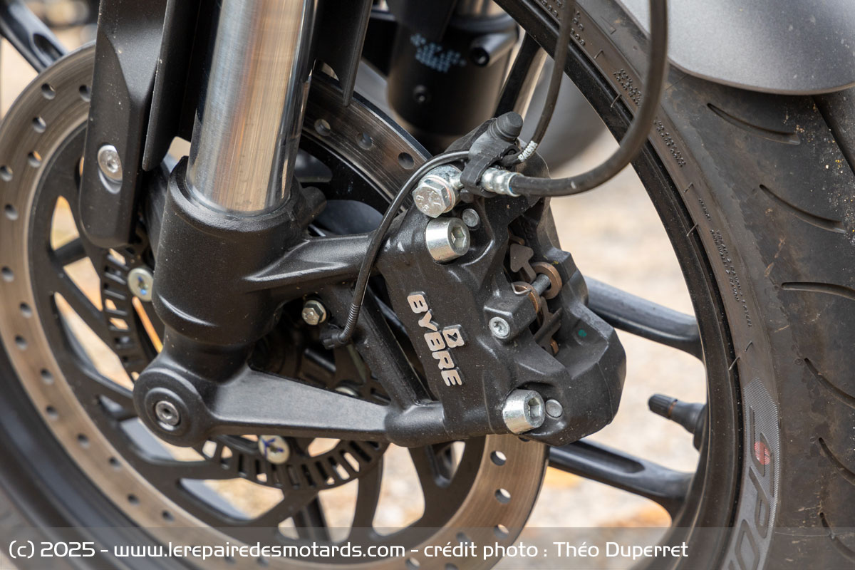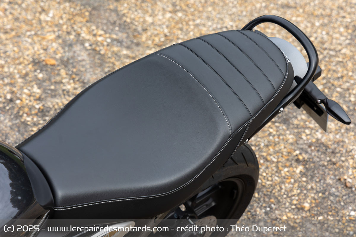 En matière de finition, l’écart se creuse nettement. La Speed 400 fait honneur à la réputation du constructeur d’Hinckley. La peinture du réservoir soignée, une fourche inversée valorisante et des petits détails, comme les soudures de boucles arrière ou même le câblage discret, montrent que les usines indiennes de Bajaj ont respecté à la lettre le cahier des charges premium de Triumph. D’autres équipements, comme les durites de freins tressées ou encore les (très) petits rétro-embouts de guidon, affichent une qualité inattendue pour une moto dite “d’entrée de gamme”. On a réellement l’impression d’être face à une moto de milieu de gamme, plutôt qu’une entrée de gamme A2.