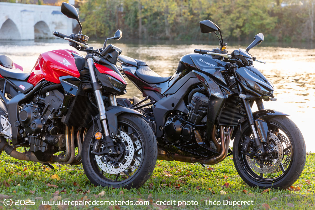 Verdict instrumentation & commandes : On a vraiment à faire ici à deux philosophies technologiques différentes. Sur la Honda, il faut aimer expérimenter en triturant les boutons sur le guidon, explorer les menus, sous-menus, etc. Sur la Z, les possibilités sont un peu plus limitées, car, pour Kawasaki l’important est peut-être de rouler. Pour cette raison, Antonin donne son point à la Kawa. Pour sa part, Théo a préféré le fonctionnement de la Hornet.