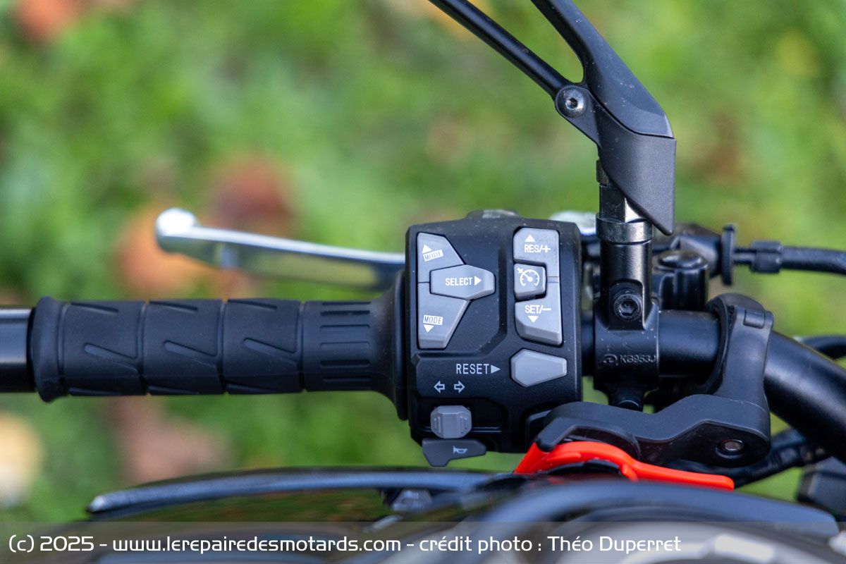 Pour ce qui est des commandes, les deux machines ont des commodos globalement épurés avec une disposition des boutons pratiquement similaires. Toutes les commandes qui servent à manipuler les menus se situent sur le côté gauche. Et sur la droite se trouvent le coupe-circuit et le démarreur. La différence est que Kawasaki opte pour de gros boutons facilement accessibles, même avec des gants épais pour l’hiver. Chez Honda, on a préféré l’option joystick multidirectionnel. On admet volontiers qu’il est plus facile de changer de modes de conduite sur la Honda que sur la Kawa, car elle est dotée d’un bouton directionnel unique dédié à cet usage. Alors que sur la Z, il faudra se servir des boutons qui servent aussi à faire défiler les informations liées aux trips partiels et effectuer un appui long, gaz coupés.