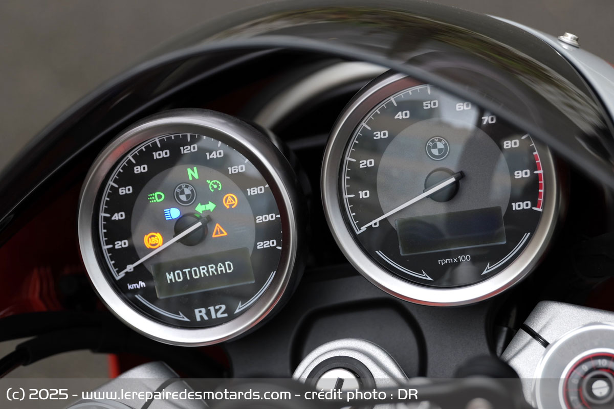 Forte de son identité de Néo rétro, la R12 S met également en avant son Boxer, le « 1200 » à refroidissement air/huile, dernier du nom, elle profite de ses arguments autant que de son image. Passé Euro5+, lui reste-t-il suffisamment d’âme ? Au moins cette version est elle moins assagie que sur le custom et tout aussi vaillante que sur la G/S, avec moins de poids à emmener. Tiens donc, comme c’est intéressant. De plus, il n’est point trop bridé par des assistances inutiles et se contente d’un contrôle de traction aisément désactivable au guidon (par un bouton dédié), d’un ABS simple là encore et bien entendu d’une transmission par cardan, tandis que la fourche est inversée et non pas de type Telelever, un élément à présent réservé à la série des R1300 : les « modernes ». Et si le numérique vous tente davantage, contre 130 € à la commande, vous aurez droit au petit afficheur digital couleur au format panoramique.
