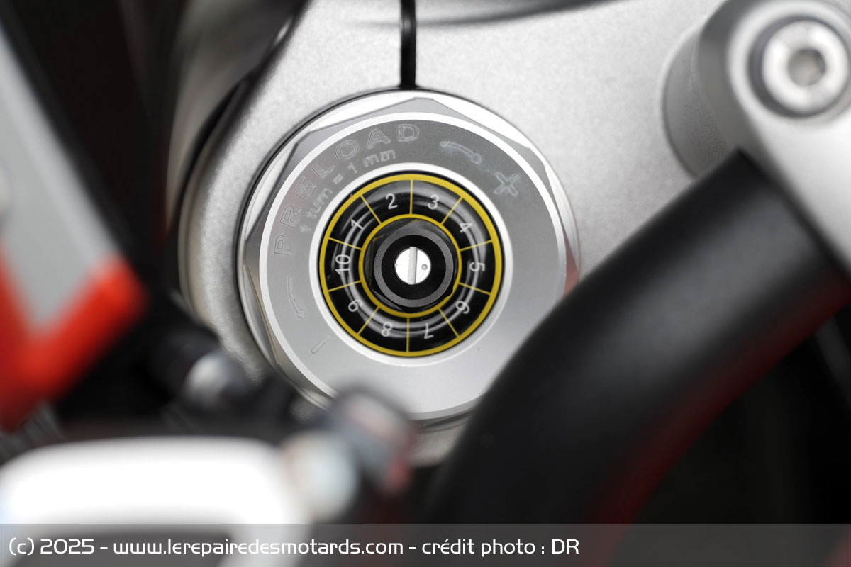 Certes, la garde au sol demeure « limitée » malgré des platines remontées reculées, mais il reste encore une marge importante avant que l’on ne prenne le moindre risque. Surtout, l’absence de béquille centrale offre de se faire un plaisir fou dans la moindre portion sinueuse et d’en redemander. Habile aussi bien dans le lent qui se (re)ferme que dans le rapide qui s’ouvre, stable, elle inscrit un sourire idiot sur le visage et rassure e son comportement prévisible et constant dans la performance. Elle n’est pas que belle, elle est fidèle et engagée, précise et pertinente. Le contrôle de traction, pour sa part, n’intervient qu’à bon escient tout en convainquant le moment venu de sa pertinence. Le désactiver, c’est retrouver une part d’humilité et de tact nécessaire, surtout dans les conditions précaires. Pour l’heure, les courbes s’enchaînent en toute quiétude.