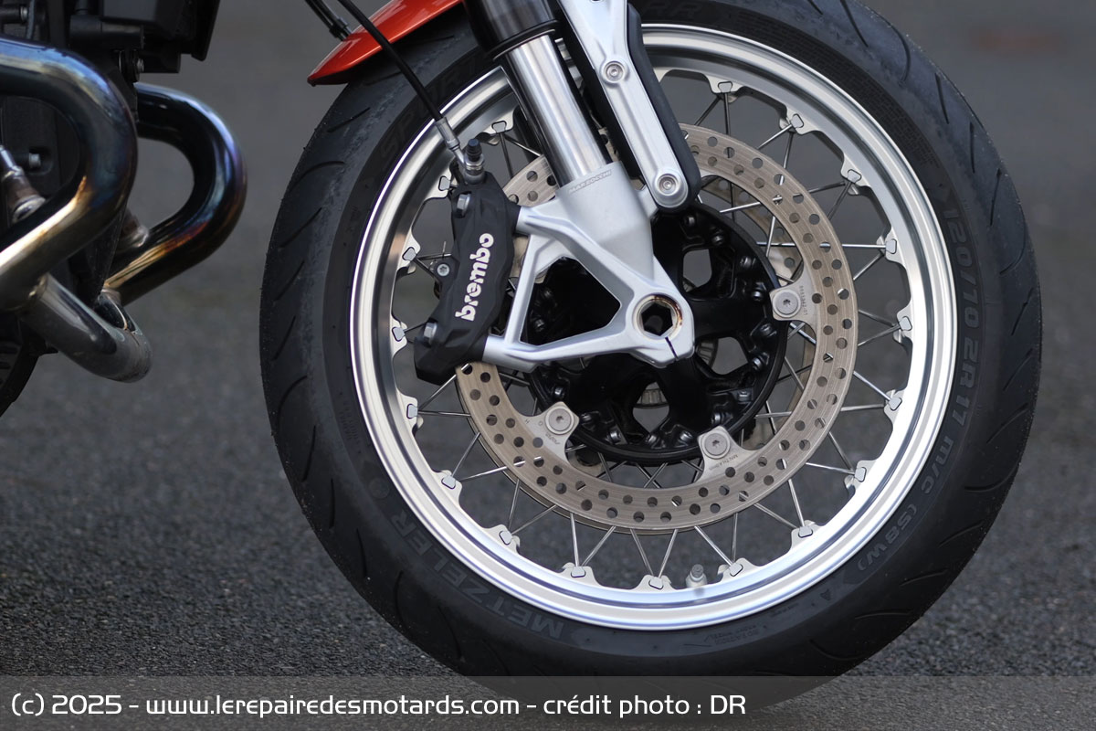Si j’ai coutume de critiquer le freinage semi-intégral de BMW, il est ici particulièrement efficace et peu gênant, composant efficacement avec le cardan comme avec les étriers Brembo M4.32 à fixation radiale. Les deux disques de 310mm de la roue avant profitent d’une puissance idéalement dosable et même de capacités sportives. Forcément, la moto est la moins lourde des R12 ! Et l’on en profite.