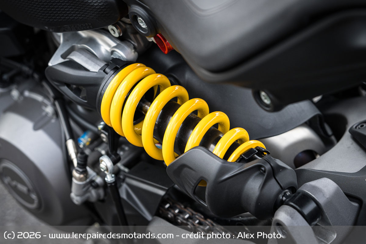 Elle repose sur une fourche Showa de 43 mm, étrangement dépourvue de réglage qui débat sur 130 mm. Monté horizontalement sans biellette sur le côté gauche, ajustable uniquement en précharge, l’amortisseur coulisse sur 145 mm. Les deux éléments sont entièrement ajustables. Notez le superbe bras oscillant aluminium ajouré de forme boomerang au revêtement granité, inspiré de celui de la… V4.